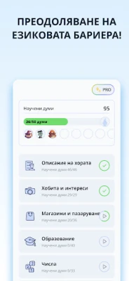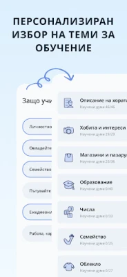 Независимо дали се нуждаете от общи познания или специфична лексика, Английски език за начинаещи ви дава гъвкавост. Изберете от обширен набор от теми като "Семейство и приятели", "Пътуване", "Професии", "Здраве" и много други, за да адаптирате обучението към личните си интереси и нужди. С ежедневни уроци, изискващи само 5 до 20 минути, можете постепенно да изградите солидни езикови умения. Всеки урок е структуриран така, че да развива четири ключови аспекта: усъвършенстване на произношението, подобряване на разбирането, трениране на четенето и превода, както и овладяване на правописа чрез съставяне на думи от букви.