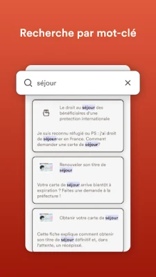 Réfugiés.info разполага с интуитивни функции, които превръщат търсенето на информация в лесно и ефективно преживяване. Чрез насочено проучване можете да изследвате десетте основни тематики за интеграция, прецизирайки нуждите си, за да откриете най-подходящите и полезни материали. Оптимизираното търсене позволява директно търсене по ключови думи на желания от Вас език, като системата интелигентно коригира печатни грешки и разбира синоними. За да запазите важна информация, можете да използвате функцията "Любими" и лесно да споделяте намерените данни с близки и приятели. Персонализацията е ключова – приложението филтрира информацията според Вашия град, възрастова група и ниво на френски език, гарантирайки, че получавате най-релевантните съвети и възможности.